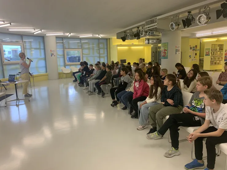 Frederick TAG – Uticha Marmon stellte ihr Buch „Das stumme Haus“ in der Stadtbibliothek den 5. Klassen vor. Einfach super!